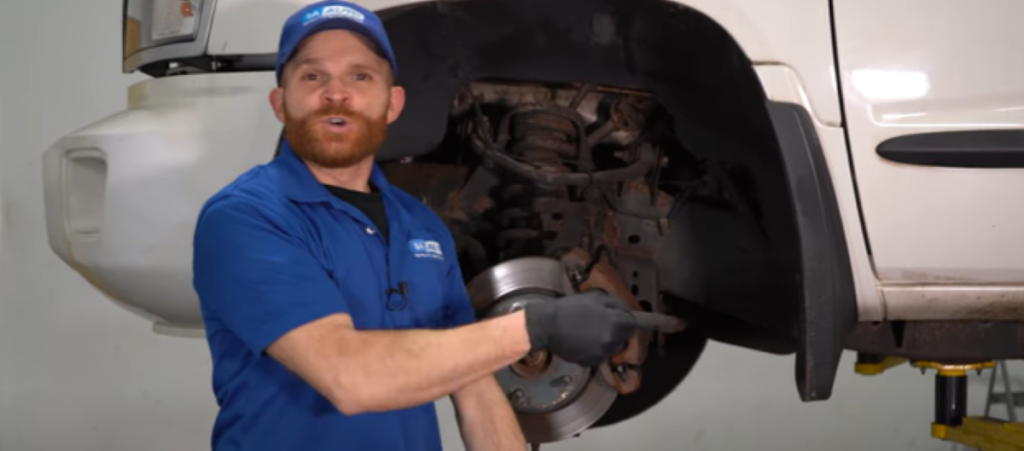 You can also loosen the lug nuts from the tire with a breaker bar as the wheel’s on the ground, raise and secure the truck with a jack and jack stands, and remove the lugs nuts and tire. Pinch the upper ball joint with pliers and check for looseness or a lot of movement. Also check the ball joint for damage like tears.